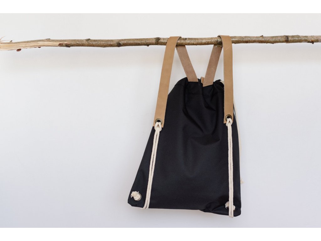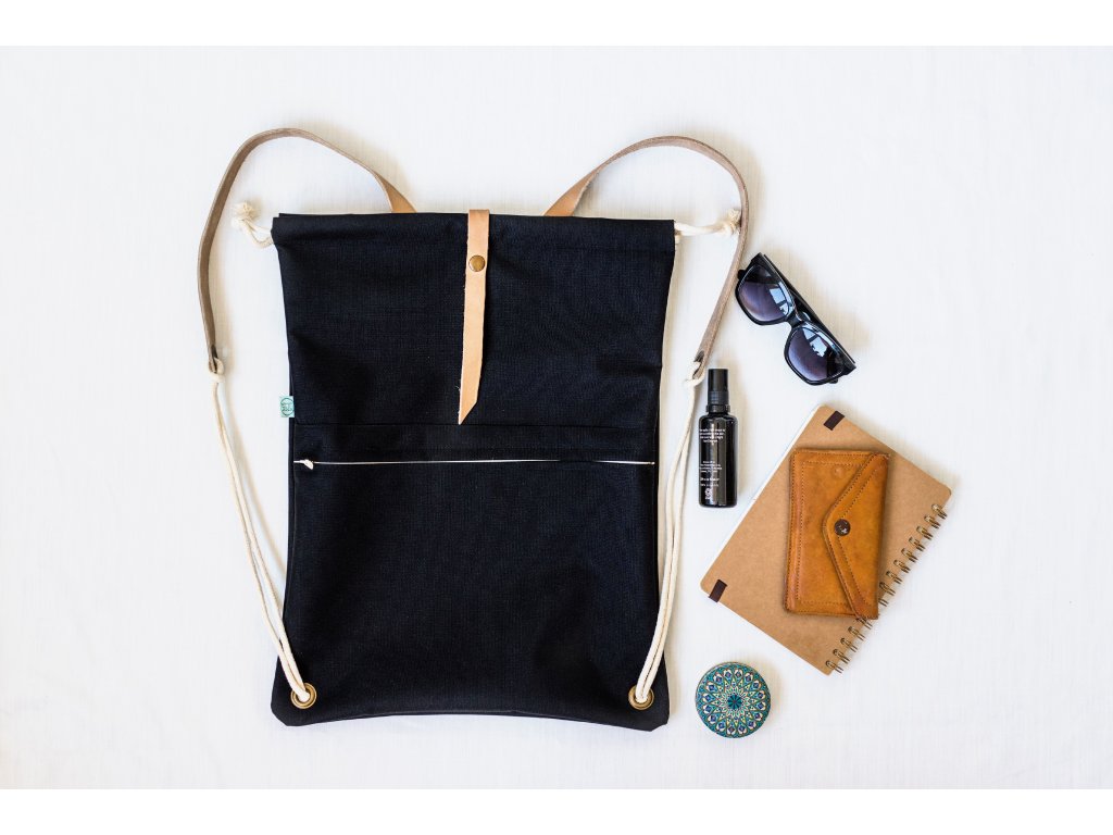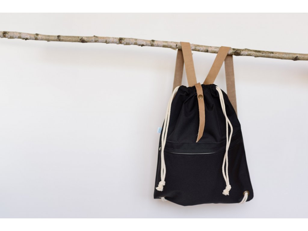 Vyroben z technické metráže Kortexin, který je nepromokavý, odolný, skladný a pohodlný. Má kožené popruhy, koženou přezku a kovové doplňky. V přední části je velká kapsa na zip. V horní části se stahuje na bavlněné šňůry.